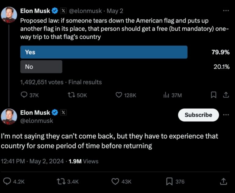 On Thursday, May 2, Musk took to social media to share his bold idea. He suggested a new law that would send protesters to the country represented by the flag they choose over the American one. In his post, he stated, “Proposed law: if someone tears down the American flag and puts up another flag in its place, that person should get a free (but mandatory) one-way trip to that flag’s country.”