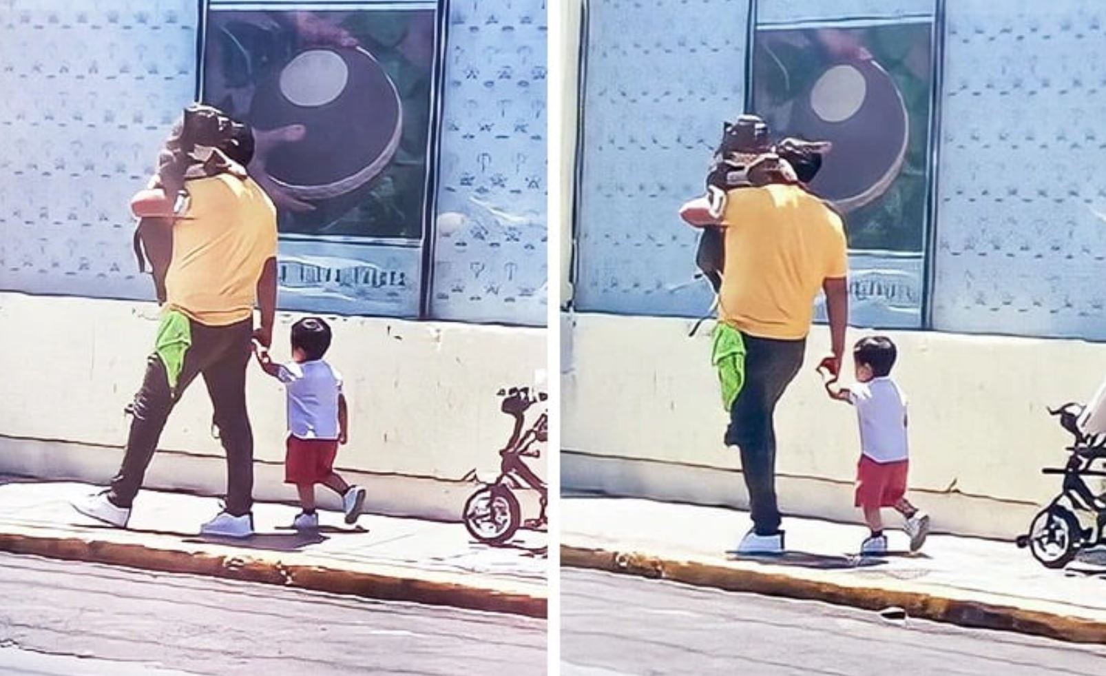 Others suggested the dad was carrying the dog because the sidewalk was too hot for its paws, while the child’s shoes protected his feet.